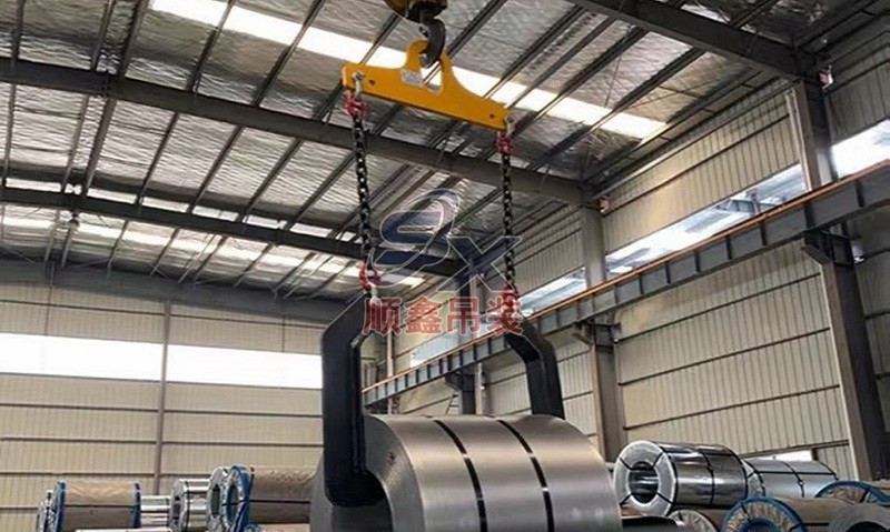 C型吊具適用于鋼卷的水平吊運(yùn),由吊具體和配重鐵組成。主體部分由合金鋼和鋼管拼接而成,截面為箱型結(jié)構(gòu),配重鐵起調(diào)節(jié)吊具平衡的作用,使吊具和被吊物的重心在一條線(xiàn)內(nèi)。載荷范圍:3.2-32噸。